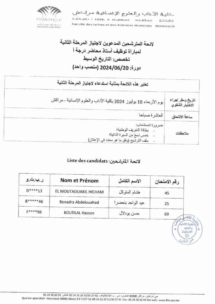لائحة المترشحين المدعوين لاجتياز المرحلة الثانية لمباراة توظيف أستاذ محاضر درجة أتخصص: التاريخ الوسيط