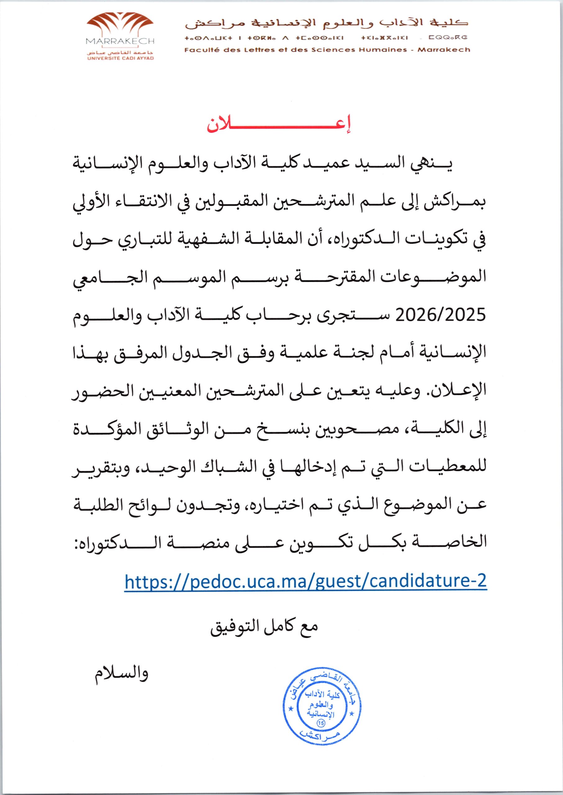 إعلان عن المقابلات الشفهية بسلك الدكتوراه الموسم الجامعي 2025-2026