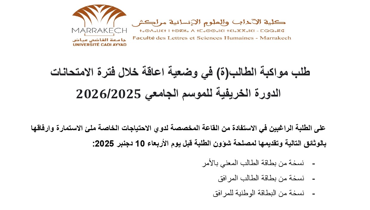 طلب مواكبة الطالب(ة) في وضعية اعاقة خلال فترة امتحانات الدورة الخريفية للموسم الجامعي 2026/2025