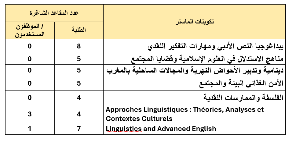يخبر عميد كلية الآداب والعلوم الإنسانية طلبة سلك الماستر المدرجة أسماؤهم بلوائح الانتظار برسم السنة الجامعية 2024- 2025 أن المقاعد الشاغرة موزعة على الشكل التالي: