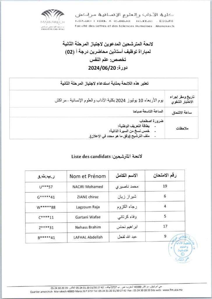 لائحة المترشحين المدعوين لاجتياز المرحلة الثانية لمباراة توظيف أستاذين محاضرين درجة أ (02)